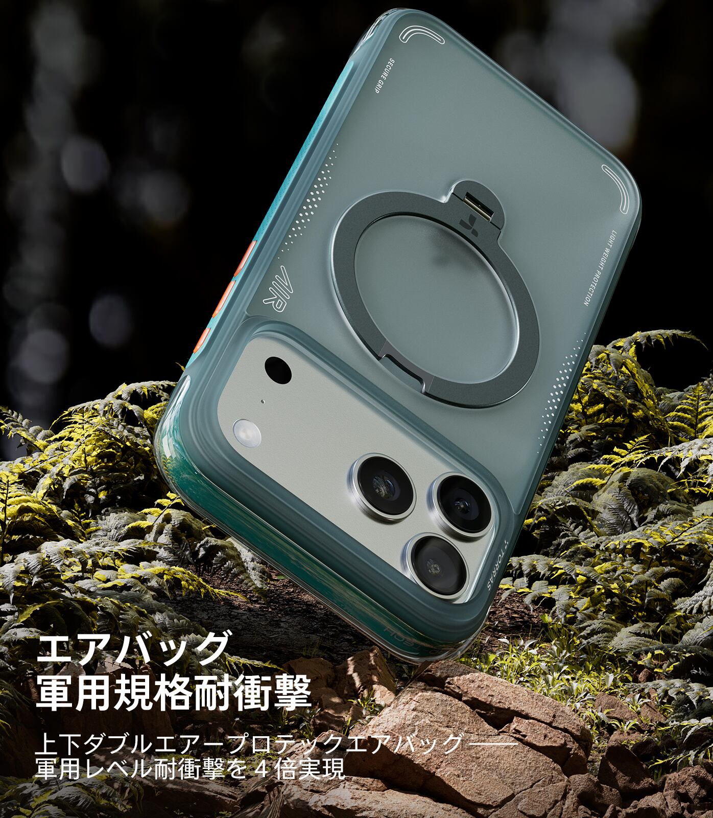 【見える最強防御!Airバッグ搭載】世界初のエアバッグ技術を搭載、業界初のエアダイナミック緩衝構造を搭載 —100% 空気力学構造が落下・衝突・摩擦を瞬時に分散吸収!米軍規格 4m耐落下防護性。4m 高さから 100 回落下しても亀裂を生じにくい。-20℃~60℃の温度変化や湿度 95% 環境下でも材質劣化せず。満員電車でバッグから滑落、デスクワーク中のうっかり滑り、登山時の岩場での手滑り、クライミング中の装備からの脱落、山道ハイキングでのポケットからの飛び出し、ランニング時の振動での落下、サイクリング中の激しい振動… どんなアクシデントでも、フチを1.44mm わずかに高く設計。 特にアウトドアでの使用時は、石や地面との接触による衝撃もしっかり吸収し、冒険中も安心してスマホを使える。更に、ケース本体はアップグレードし、従来モデルより 6g 軽量化を実現した —— 高い防護性能を維持しつつ、持ち運びやスマホの操作性も向上する。目で見える全方位保護で、いつも安心感をパックしている。