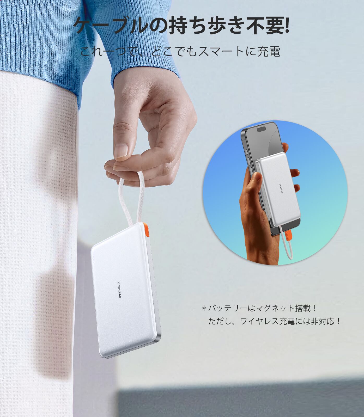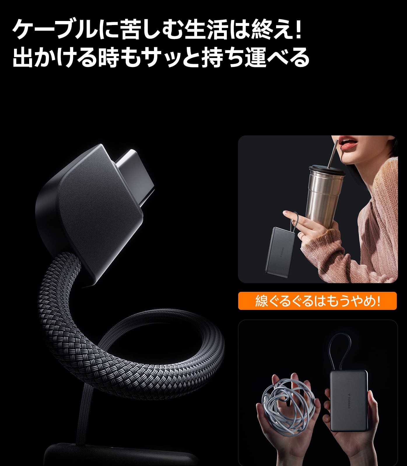 【Type-Cケーブル内蔵、高耐久】 ケーブルを本体に内蔵した一体型設計で、必要なときにサッと引き出してすぐに充電が可能。ケーブルを別途持ち歩く手間がなく、外出先や移動中でもスマートに使えます。ケーブル部分はストラップとしても活用できる新しいアイデアを採用します。バッグや指に引っ掛けて、気軽に持ち運びができます。さらに、ロッククライミング用ロープ基準に基づく高強度ナイロン製ケーブルは、2万回以上の曲げに耐え、5年以上使用可能です。