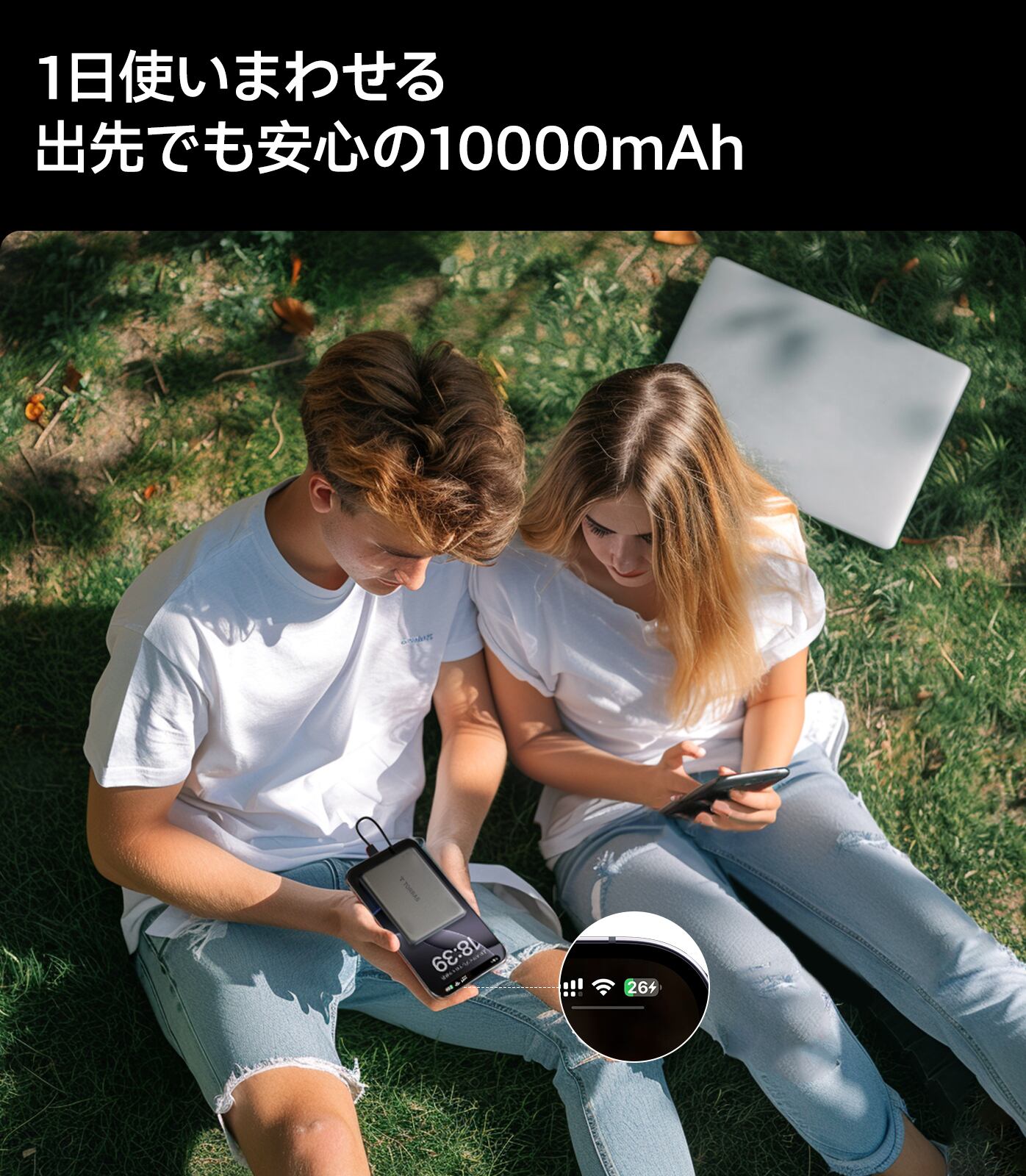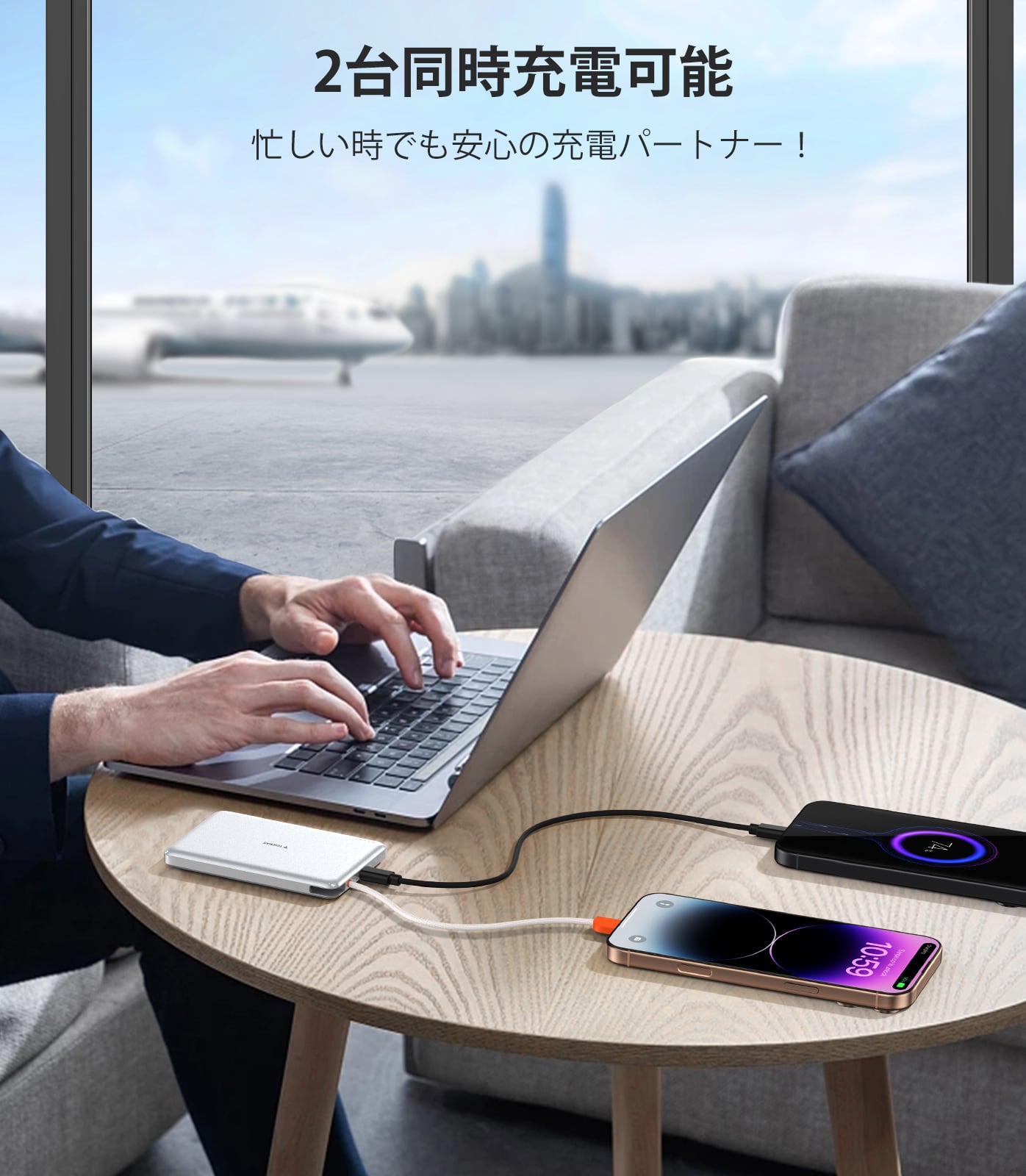 【22.5w急速充電、パススルー対応】 最大22.5Wの高出力に対応し、iPhoneと同等の高性能チップを搭載しています。iPhone 17なら、わずか30分で0%から75%まで一気に充電可能。バッテリー切れの緊急時でも、短時間でしっかり充電できます。iPhoneやタブレット、Switchなど幅広いデバイスにパワフルに対応します。 さらに、パススルー機能にも対応しているため、本体を充電しながらスマホへ給電することもできます。日常のあらゆる場面で、頼れる充電パートナーとして活躍します。