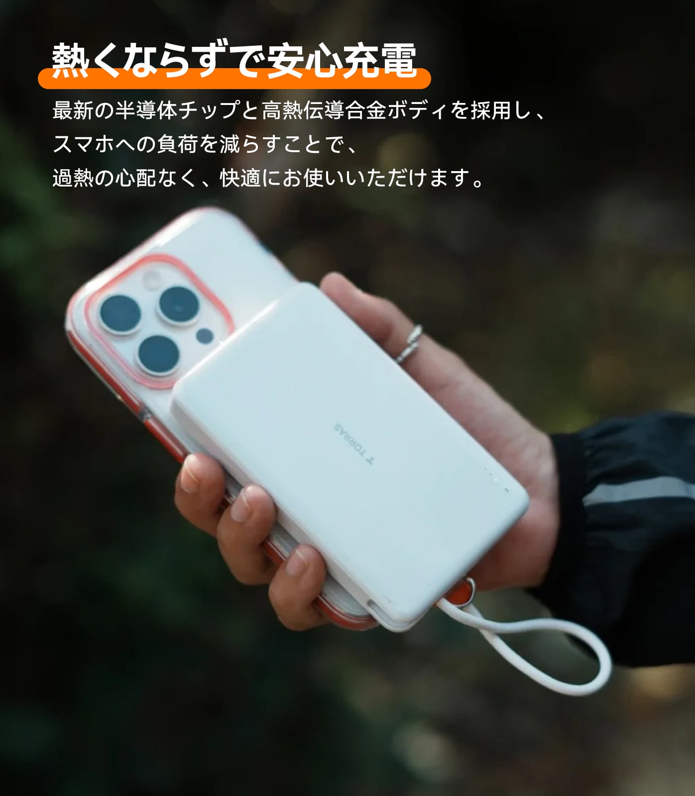 TORRAS MiniMag モバイル バッテリーPebbleLink Powerbank ケーブル内蔵【2025アップグレード版】タイプC 低温 10000mAh 大容量 PD22.5W 急速充電 軽量 薄型 有線充電 iPhone 17 15 16 Android ipad PSE認証済み 機内持ち込み可