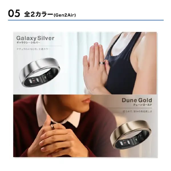 [内容物] RingConn Gen 2 Air x 1、充電ドック x 1、1m/3.3フィート USB-C - Cケーブル x 1、取扱説明書 x 1、効率的なカスタマーサポートとサービス。